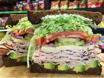 Maple glazed honey turkey, Pepper Jack cheese on squaw with lettuce, tomato, onion, pickle, mayonnaise and honey mustard. Avocado Additional.