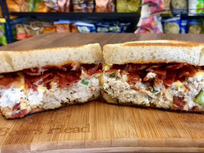 Fresh homemade Albacore Tuna with Melted Yellow American Cheese topped with Crispy Smoked Bacon & Cajun Mayo on a toasted sourdough bread .