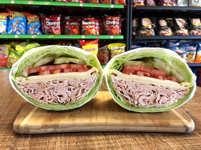 Lettuce Wrap filled with Maple Glazed Honey Turkey, Swiss, Muenster & Provolone Cheese, tomato, pickle & honey mustard.