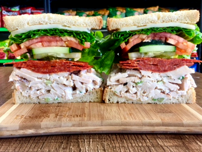 Homemade Chicken Salad, Sandwich Style Pepperoni, Swiss Cheese, Tomatoes, Pickles & Cucumbers on toasted sourdough bread.