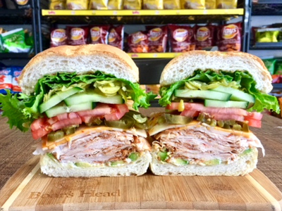 Bold Salsalito Turkey, 3 Pepper Colby Jack Cheese, Lettuce, Tomatoes, Jalapenos, Pepperoncini, Cucumbers, Avocado, Honey Mustard & Mayo on a toasted French roll