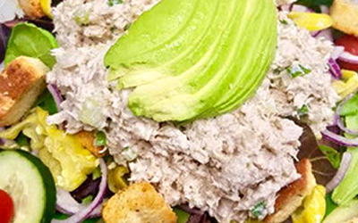 Mixed greens topped with tomatos, cucumber, pepperoncini, avocado, onions, croutons and homemade Albacore Tuna salad