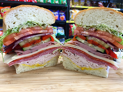 Ovengold Turkey, Genoa Salami, Provolone Cheese, Honey Maple Glazed Ham, Pepperoni, Cherry Peppers, Onions, Cucumbers, Lettuce, Tomato, Basil Oil & Vinegar Mayo & Mustard on a French Roll.