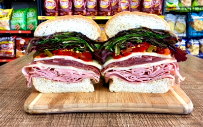 Mortadella with Pistachio, Prosciutto Di Parma, Mozzarella, Provolone, Sweet Roasted Peppers, Hot Cherry Peppers, & Mixed Greens on a roll with Spicy Deli mustard & Mayo.