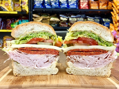 Oven Gold Turkey , Pepperoni, Mozzarella Cheese, lettuce, Tomatoes, Pickles, Pepperoncini, Mayo & Spicy Mustard on a French Roll