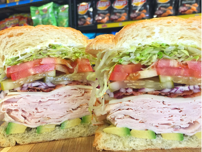 Maple glazed honey turkey, Swiss Cheese, bacon, avocado, lettuce, tomato, onion, pickle, mustard and mayonnaise.