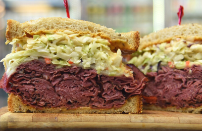 1st cut pastrami brisket or top round corned beef with Swiss cheese, Cole Slaw and 1000 Island dressing on rye bread.