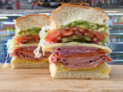 Mortadella, hot butt cappi, sandwich style pepperoni, Genoa salami and Provolone cheese with lettuce, tomato, onion, pickle, mustard, mayonnaise and Italian dressing.